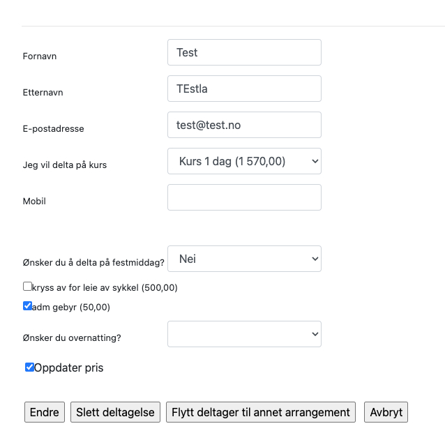 MERK: Vi har ingen løsning for etterfakturering pr idag, så om deltageren f.eks har valgt en billettkategori med feil pris må de istedet melde seg på på nytt med riktig kategori og man kan så kreditere deltagelsen med feil kategori.